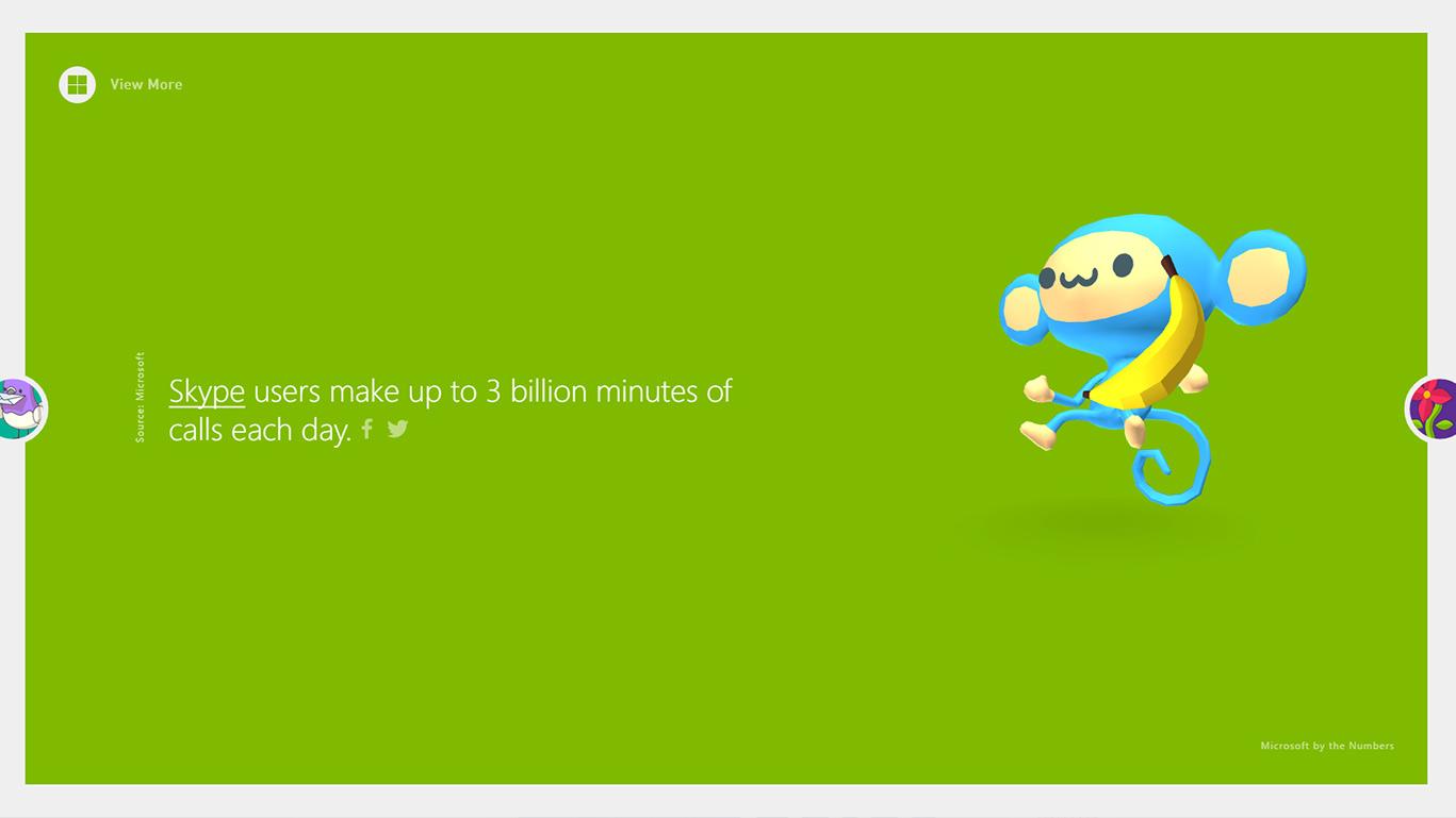 Statistics can be cold and uninviting, but these numbers are the pulse of any company—monitors of both internal health and external impact. We aimed to change the way we look at these statistics, painting Microsoft’s big picture by reimagining its smaller ones. The result was Microsoft By The Numbers, a digital roadmap to Microsoft’s innovation, reach, and impact wrapped in an engaging animated world. By The Numbers serves as both an informational tool for employees and an approachable entry point for consumers and media, giving Microsoft’s statistics an entertaining and interactive landing site.